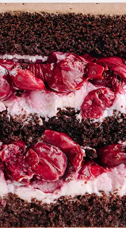 Blaturi bogate de brownie, însiropate cu sirop de ciocolată, între care se ascunde un strat de vișine dulci-acrișoare și o cremă lejeră de brânză cu frișcă. Un tort echilibrat – nici prea dulce, nici prea acru.