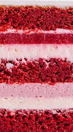 Blaturi catifelate red velvet, însiropate cu sirop de căpșuni, completate de cremă de brânză și mousse aerat cu inserturi de căpșuni.