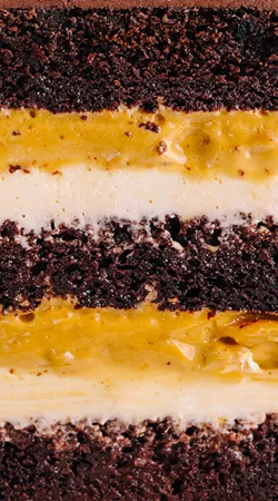 Blaturi pufoase de vanilie cu note de portocale + cremă fină de brânză și mascarpone. Inserturi dulci-acrișoare de mango și fructul pasiunii.